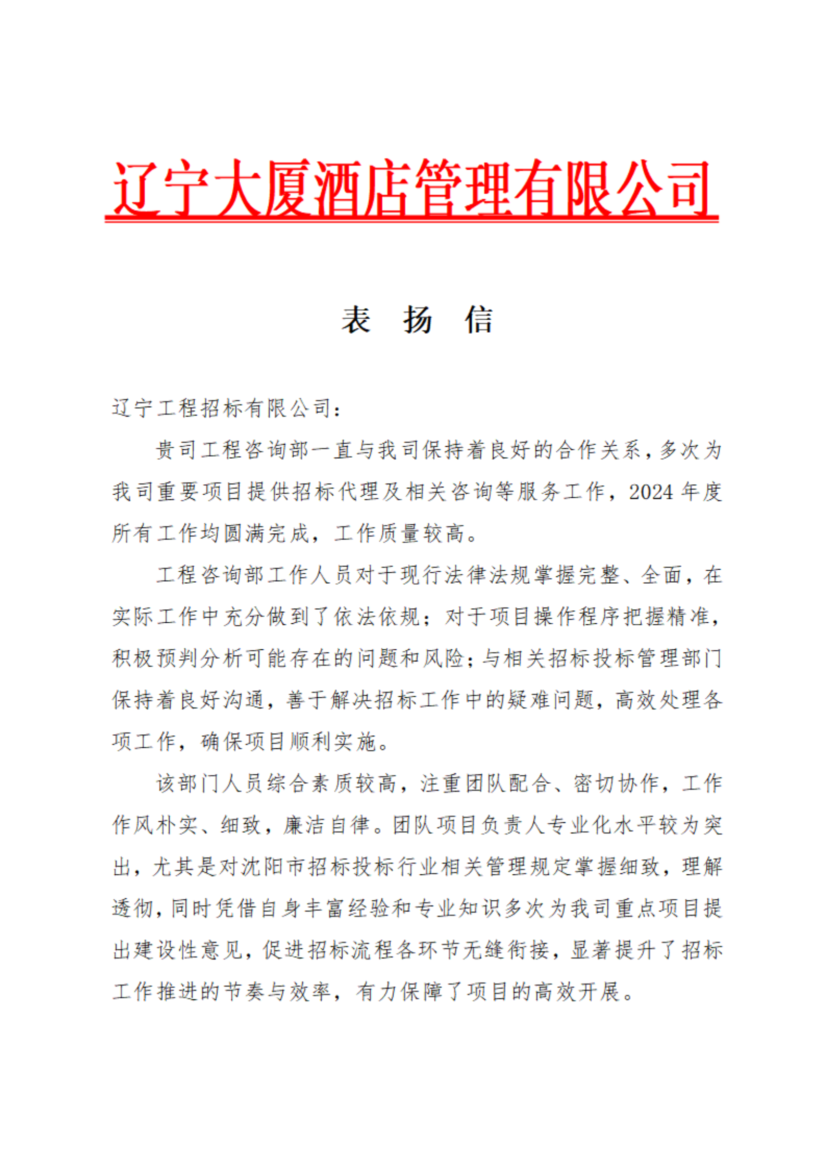 近日,公司收到遼寧大廈發(fā)來(lái)的表?yè)P(yáng)信,對(duì)公司業(yè)務(wù)團(tuán)隊(duì)在招標(biāo)代理及相關(guān)咨詢服務(wù)等工作中表現(xiàn)出的豐富經(jīng)驗(yàn)和專業(yè)水平表示認(rèn)可。